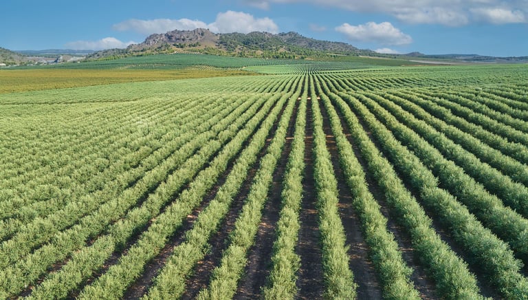 A sunlit olive grove with rows of healthy olive trees stretching into the distance under a clear blue sky.